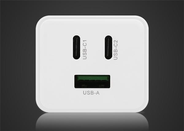 充電器配備兩個USB-C和一個USB-A輸出接口,單獨使用均支持快充,其中USB-C1最大功率65W,兼容5V/3A、9V/3A、12V/3A、15V/3A、20V/3.25A;USB-C2最大功率30W,兼容11V/3A、16V/2A、5V/3A、9V/3A、12V/2.5A、15V/2A、20V/1.5A,USB-A最大功率24W,兼容4.5V/5A、5V/4.5A、9V/2A、12V/2A。即便同時使用兩個接口也可實現快充,比如USB-C1+USB-C2、USB-C1+USB-A都可以最高輸出63W,分別為45W+18W,USB-C2+USB-A最高可輸出60W,分別為45W+15W。